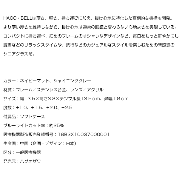 シニアグラス 老眼鏡 ハコベルハグオザワ HACO BELL 使い心地にこだわった薄いシニアグラス ブルーライトカット■商品詳細HACO・BELLは薄さ、軽さ、持ち運びに加え、掛け心地に特化した画期的な機構を開発。